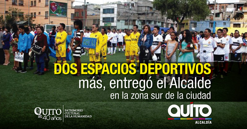 La mañana y tarde de este domingo 11 de marzo, el alcalde Mauricio Rodas, entregó importantes obras de infraestructura deportiva; la primera fue en el barrio Solanda III, una cancha sintética de fútbol de 3.600 m2 y más tarde en el barrio IESS-FUT entregó una cancha de uso múltiple de básquet, vóley e índor fútbol ejecutada bajo la modalidad de presupuestos participativos.