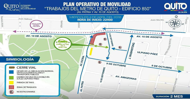 A la altura de la Ulpiano Páez se realizará un cierre en la Av. Patria hasta llegar a la 10 de Agosto, dicha acción tendrá una duración de dos meses y comenzará a partir de las 22:00 de este miércoles 4 de abril.