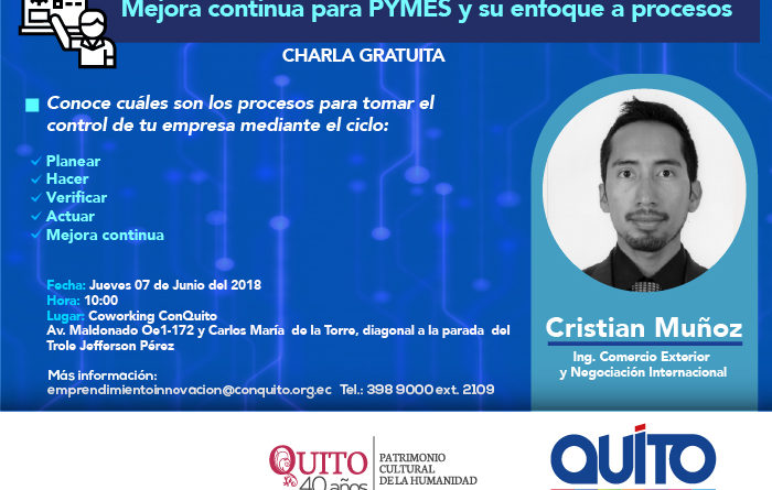 La Agencia de Promoción Económica ConQuito, en coordinación con Atenea Soluciones S.A., dictará la charla gratuita ‘Mejora continua para PYMES y su enfoque a procesos’, que se realizará el jueves 7 de junio, desde las 10:00, en el espacio de Coworking.