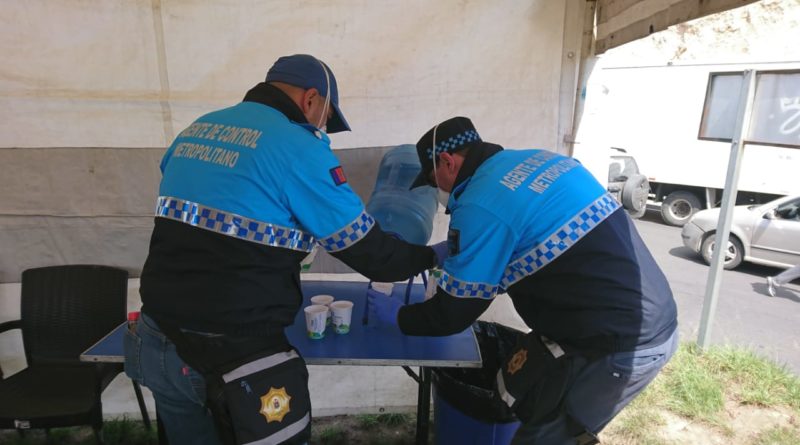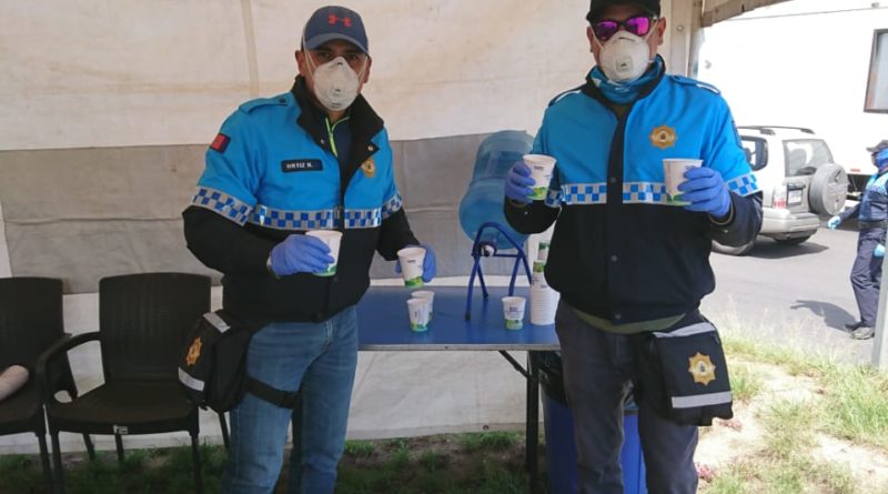 Están repartidos por sectores y, desde las 06:00 de la mañana y equipados con todas las medidas de bioseguridad, arman las carpas de los puntos de hidratación, dejan botellones y vasos El agua también sirve para preparar la mezcla con la fórmula de hipoclorito de sodio para la fumigación. Por el toque de queda, todos los implementos se recogen desde el mediodía.