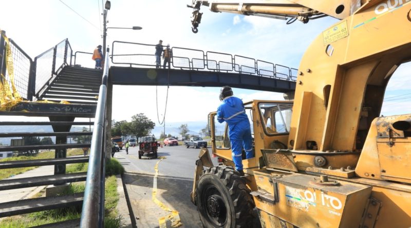 Este jueves 9 de julio, trabajadores y maquinaria de la Empresa Pública Metropolitana de Movilidad y Obras Públicas –Epmmop- estabilizaron la estructura y reubicaron el tablero del puente peatonal ubicado en el sector de la Loma de Puengasí, sobre la Av. Simón Bolívar, en sentido norte-sur, en el que un vehículo se impactó la noche anterior.