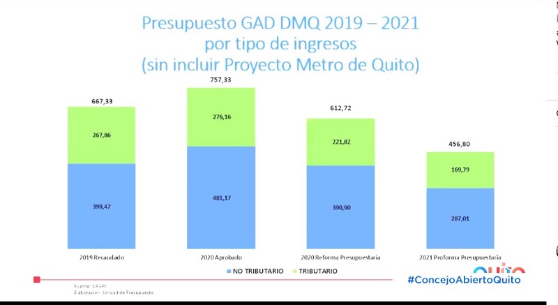 El Alcalde Dr. Jorge Yunda Machado dijo que el no tener 300 millones para el año 2021 le coloca a la ciudad en una difícil situación. Los recursos se utilizan con austeridad y es necesario fomentar el empleo. Hay que fortalecer el servicio público para enfrentar la pandemia y cubrir las necesidades de la población. Es indispensable tener un banco de la ciudad, propuesta que se hizo al inicio de la gestión, para poder enfrentar nuevas crisis con los suficientes recursos. De esta manera no solo depender de las asignaciones gubernamentales y pago de tributos de los ciudadanos.