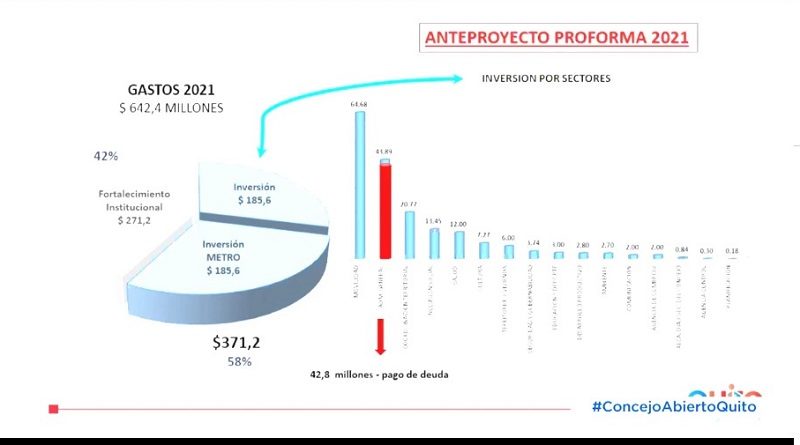 Para el 2021 se aprobó 642.4 millones, 271,2 para fortalecimiento institucional que equivale al 42 por ciento y 371.2 de inversión que equivale al 58% del presupuesto. En la inversión 185,6 millones va para el metro. Es decir, habrá 300 millones por debajo de lo presupuestado en relación al año 2020.Un 61% menos debido a que no se recaudará tasas, impuestos, más los recursos que adeuda el Gobierno Nacional.