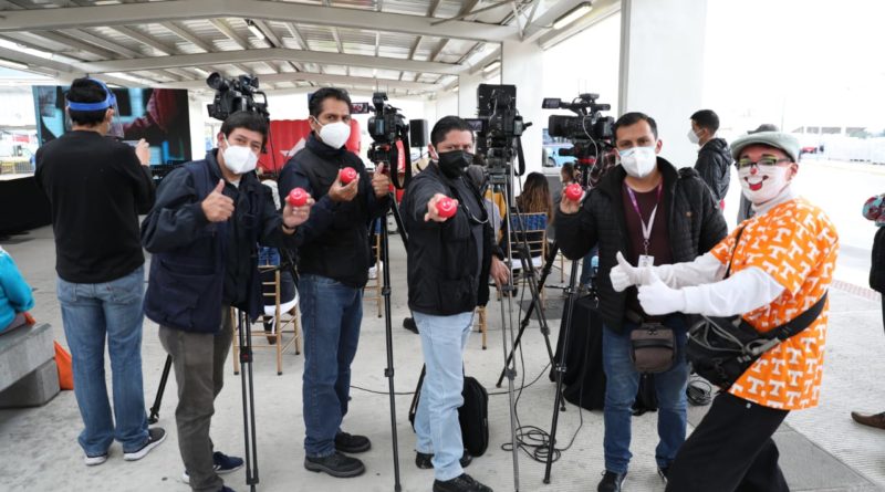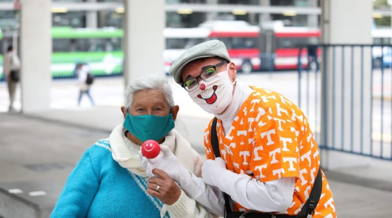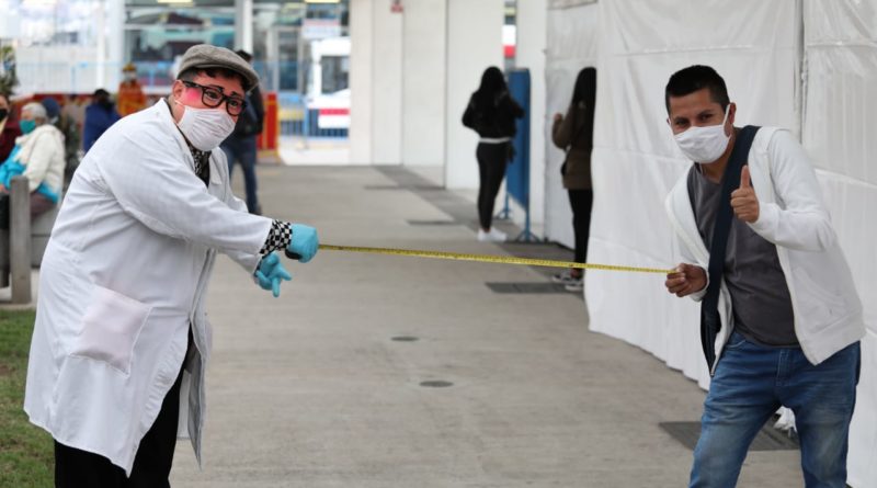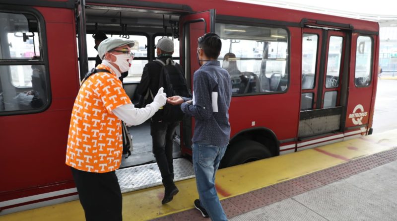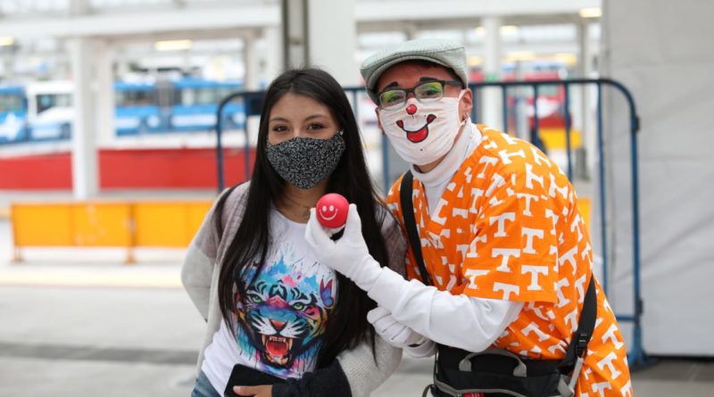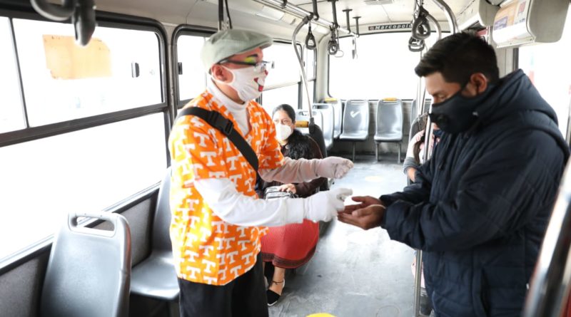 Distanciamiento social, uso de gel y de alcohol son los mensajes que promocionan los mimos en las paradas del trolebús y otras del servicio de transporte público.