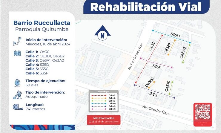 Quito,8 de abril de 2024 (Quito Informa).-Desde este miércoles 10 de abril, iniciará el adoquinado de 741 metros lineales de calles de tierra, identificadas con las nomenclaturas: Oe3C, Oe3B1, Oe3B2, Oe3A1, Oe3A2, S35D, S35G y S35F del barrio Ruccullacta (sur), en la parroquia Quitumbe.
