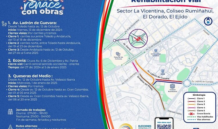 - Tercera fase (27 de diciembre al 5 de enero): Tendrá el cierre total de la vía entre la calle Andalucía y la avenida 12 de Octubre. Durante este periodo, que coincide con el feriado nacional del 2 al 5 de enero de 2025, se iniciará de manera paralela la rehabilitación del primer tramo de la calle Queseras del Medio, desde la avenida 12 de Octubre hasta la calle Gran Colombia. Posteriormente, esta intervención se extenderá hasta la avenida Velasco Ibarra.