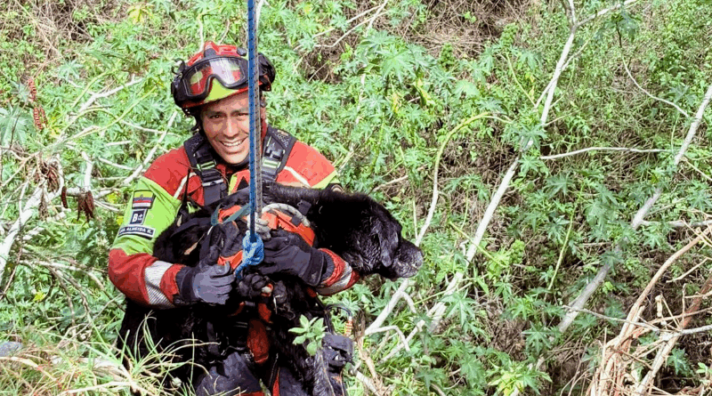 Quito, (Quito Informa). – Un llamado de emergencia desde el sector de Tumbaco activó la rápida respuesta del Cuerpo de Bomberos. Esta vez, se trataba de un miembro muy especial de una familia: Garú, un labrador de 13 años, que había caído accidentalmente a una quebrada de casi 20 metros de profundidad.