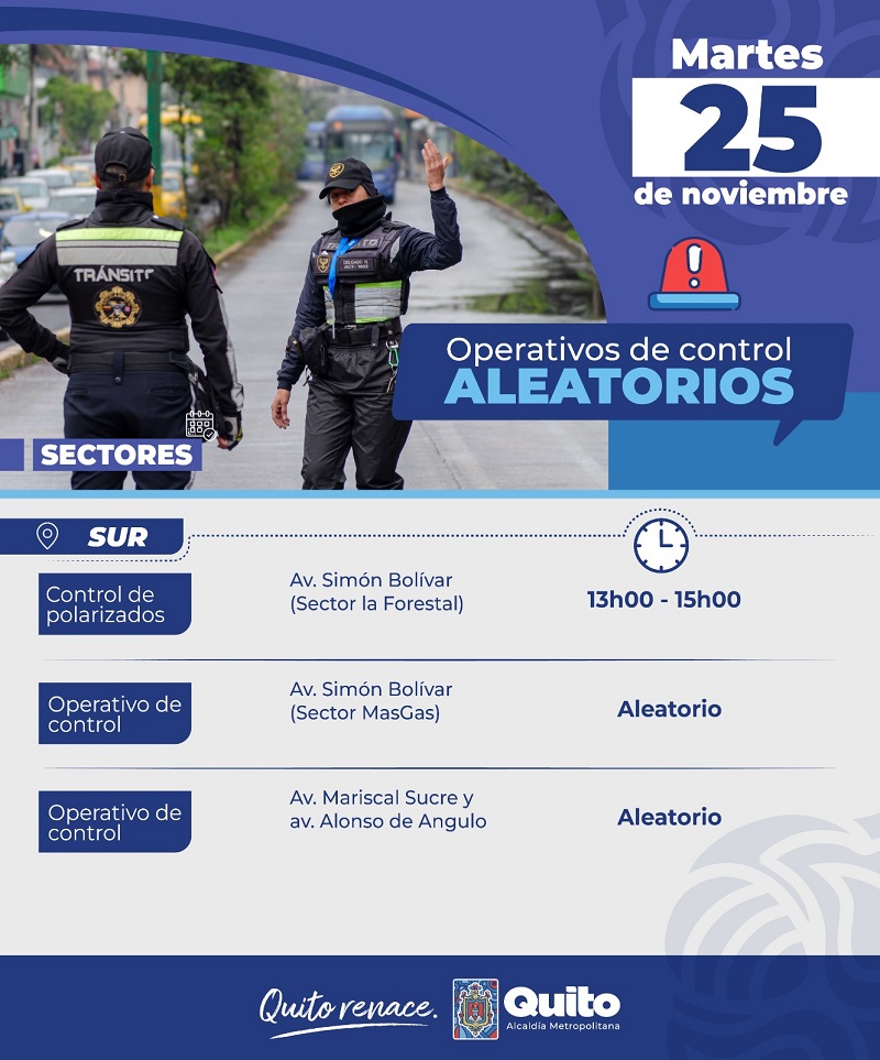 Quito, (Quito Informa).- Los operativos aleatorios de control por parte de la Agencia Metropolitana de Control se reforzarán este martes 25 de noviembre, en distintos puntos de la ciudad, con énfasis en las avenidas Simón Bolívar y Mariscal Sucre.