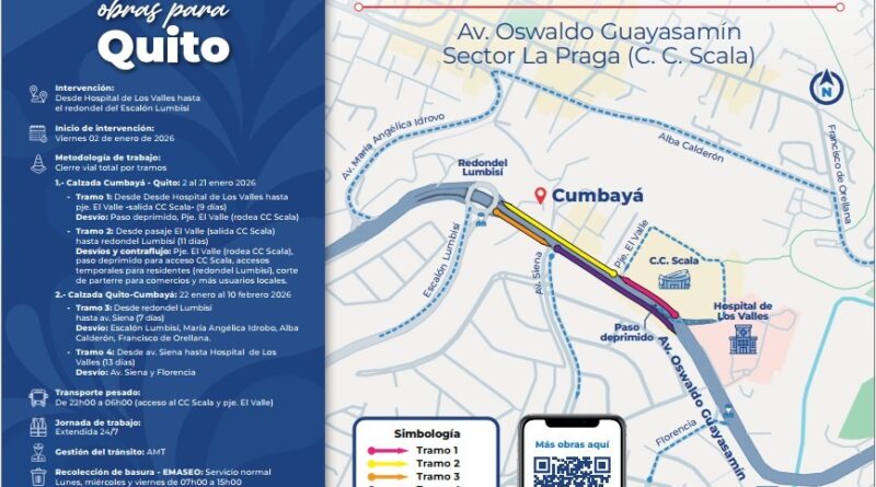 A partir del 22 de enero, los trabajos pasarán a la calzada sentido Quito–Valles, con desvíos por las avenidas Siena y Florencia desde y hacia la Ruta Viva, según el tramo intervenido. El transporte público ya ajustó sus recorridos por estas vías para garantizar el servicio durante todo el periodo de obra.