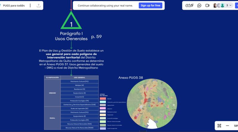 Además, la herramienta puede ser utilizada en talleres presenciales o virtuales, mesas de trabajo y procesos de participación ciudadana, ya que permite una fácil visualización de la normativa según los títulos, capítulos y secciones que conforman el PUGS vigente del Distrito Metropolitano de Quito.