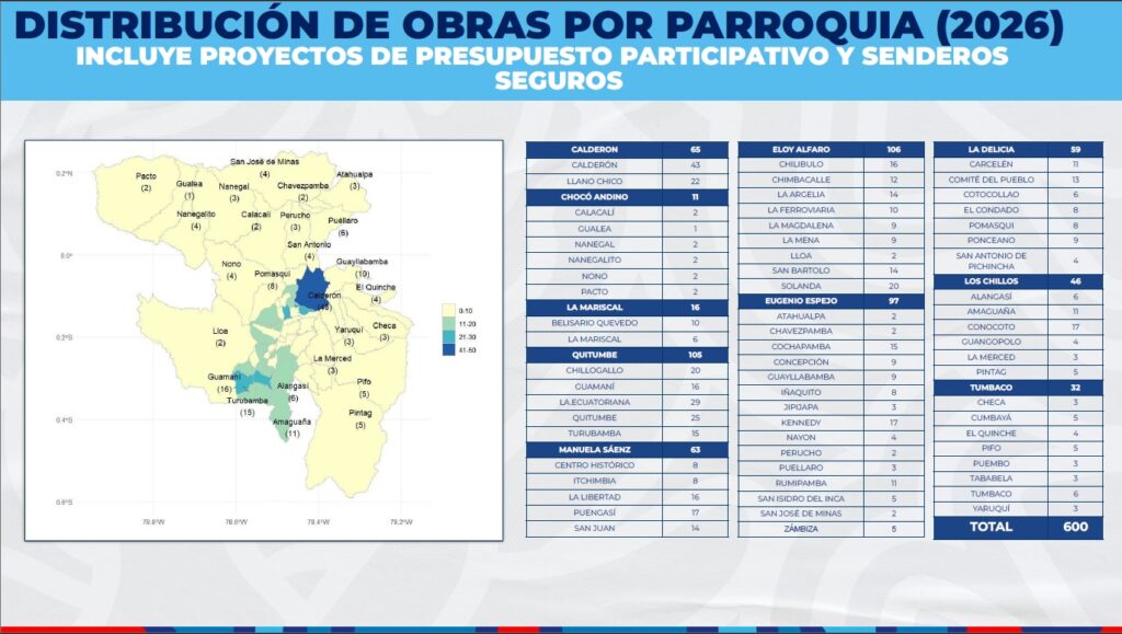El alcalde puntualizó que la distribución de obras se hace de acuerdo a la proporcionalidad con la población de cada parroquia. Por ejemplo, parroquias como Calderón concentran un mayor número de proyectos debido a su alta densidad poblacional, mientras que parroquias rurales más pequeñas cuentan con menos obras, pero acordes a sus necesidades y número de habitantes.